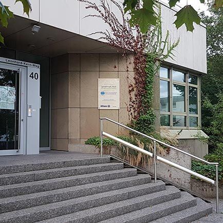 Über eine Treppe (auch rollstuhlgerechter Zugang möglich) erreichen Sie den großzügigen und offenen Eingangsbereich mit Verwaltung/Anmeldung und die Schulungsräume. Ihr Unterricht findet hier zwischen 8 und 16:15 Uhr statt. Hohe Decken, durchgängige Fensterfronten sowie Glaswände und -türen sorgen für ein luftiges Raumgefühl. Die Aussicht geht zum Teil in Richtung der parkähnlichen Anlage mit Bänken hinter dem Haus. Dort können Sie sich in Pausen bei idyllischem Vogelzwitschern entspannen. Wenn Sie lieber drinnen bleiben möchten, machen Sie es sich auf der Sitzecke gemütlich. Hier im Pausenbereich finden Sie auch einen Automaten für erfrischende Kaltgetränke sowie einen Kaffeeautomaten mit verschiedenen Heißgetränken. In der kleinen Küche stehen Kühlschrank, Geschirr, Spülmaschine und Wasserkocher bereit. Viele Teilnehmer nutzen die Mittagspause auch für einen Spaziergang zum Limpurger Platz, einem kleinen belebten Marktplatz, um sich etwas zu essen zu holen. In der anderen Richtung liegen ein Discounter und Getränkemarkt.
