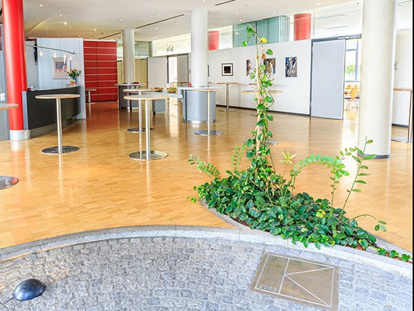 Der Weg zu Ihren Schulungsräumen im 1. OG führt Sie durch einen offenen Eingangsbereich und weiter per Aufzug oder durch das lichtdurchflutete Treppenhaus, das wechselnde Ausstellungen von regionalen Künstlern beherbergt. Auch in einzelnen Räumen ist es durch die bodentiefen Fenster schön hell.