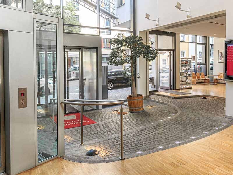 Zentral, aber ruhig: Das moderne Gebäude mit seiner großen Glasfassade liegt im Stadtzentrum, etwa fünf Gehminuten vom Hauptbahnhof entfernt. Trotzdem gibt es kaum Verkehrsgeräusche; nur die Kirchenglocken sorgen ab und zu für akustische Untermalung. Die Fußgängerzone mit ihren vielen Einkaufsmöglichkeiten und gastronomischen Angeboten beginnt in der parallel verlaufenden Eichhornstraße.